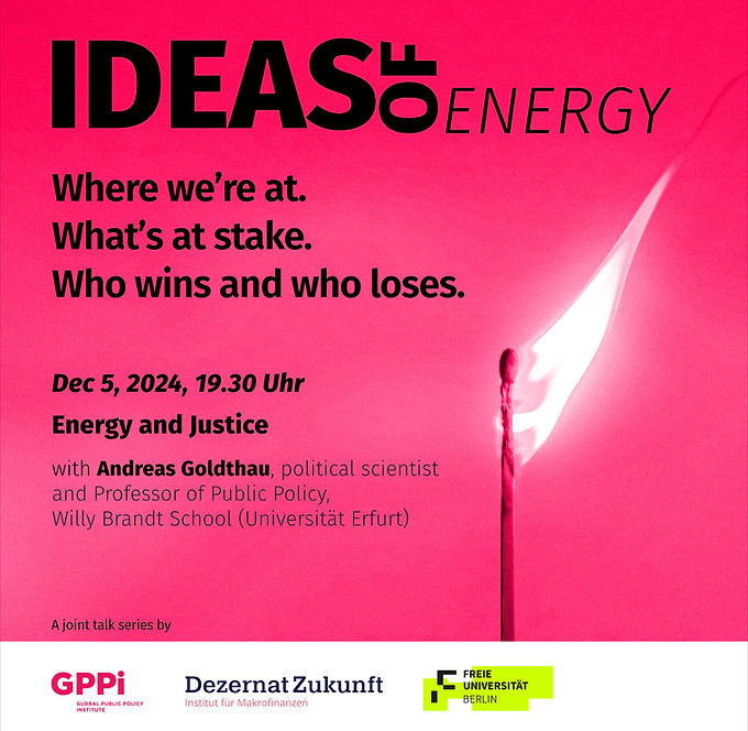 Ideas of Energy ist eine gemeinsame Veranstaltungsreihe der Freigeist Forschungsgruppe „Geopolitics in the Age of Offshore Finance“ an der Freien Universität Berlin, des Global Public Policy Institute (GPPi) und des Dezernat Zukunft. Wie immer gibt es weitere Infos im angehängten Flyer und Rückfragen können gerne an Theres Rolle (theres.rolle@fu-berlin.de) gestellt werden.